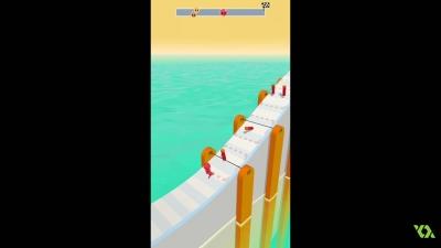 Dans les niveaux suivants, vous pouvez augmenter le nombre de joueurs dans la course, par exemple il peut y avoir des parties de trois. Chaque participant se ressemble, mais avec des couleurs différentes. Nous aurons des barres rotatives et des marteaux comme obstacles à surmonter le long de la passerelle.